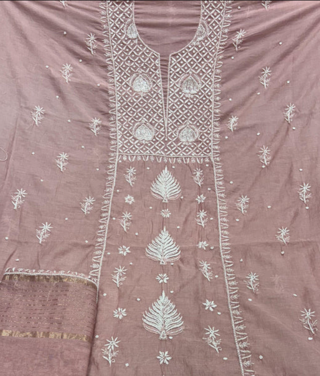 Product Description-  Pure Mulmul unstitched kurta piece with beautifully done premium handwork chikankari and Pearl work all over paired with a matching Pure Mulmul Zari Dupatta with Chikankari handwork & pearl cut daana work.