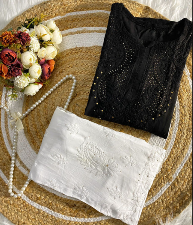 - ✨ Handcrafted Mokaish Chikankari: Exquisite black thread embroidery enhances the rich black fabric with classic elegance.
