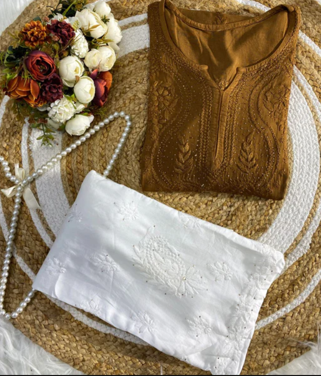 - ✨ Handcrafted Mokaish Chikankari: Exquisite brown thread embroidery enhances the rich brown fabric with timeless sophistication.