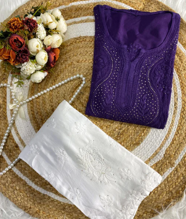 - β¨ Handcrafted Mokaish Chikankari: Detailed purple thread embroidery adds timeless elegance to the set.