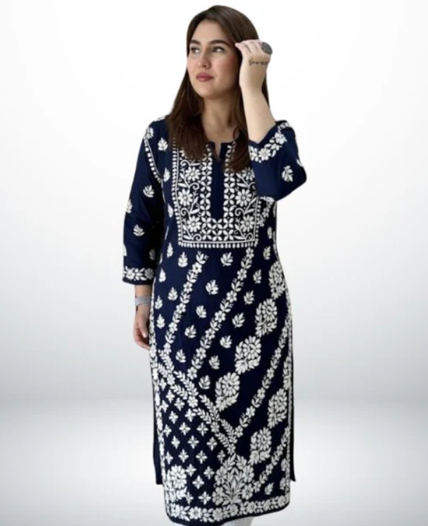 Discover timeless elegance with the ANAYA Navy Blue Lucknowi Chikankari Kurti, crafted from premium heavy modal fabric that offers a luxuriously soft feel, graceful drape, and exceptional all-day comfort. Adorned with intricate hand-style Lucknowi Chikankari work, this kurti beautifully reflects traditional craftsmanship with a modern touch.