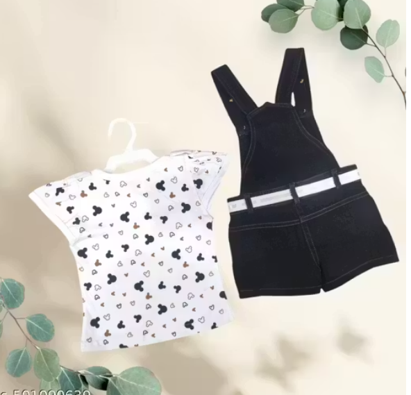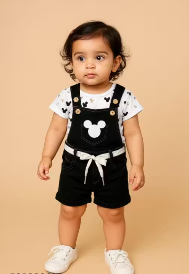 Bublee Dublee Adorable Baby Girls Black Denim Dungaree Set with Mickey Print Cotton T-Shirt