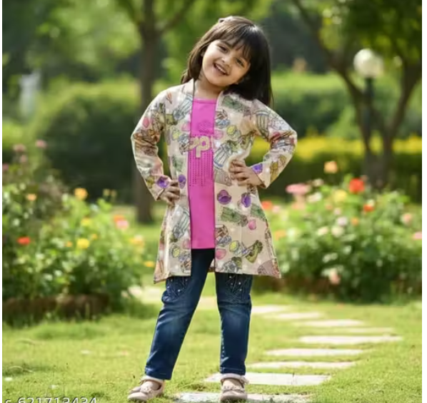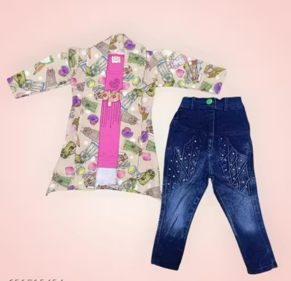 The Bublee Dublee Trendy Girls 3‑Piece Western Set is a coordinated outfit designed to give young girls a fashionable and contemporary look. Perfect for casual wear, outings, parties, school days, and weekend fun, this set includes a printed or stylish top, denim jeans, and a matching denim jacket to create a complete, put‑together look that’s both comfortable and trendy.