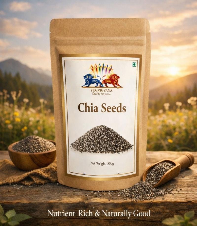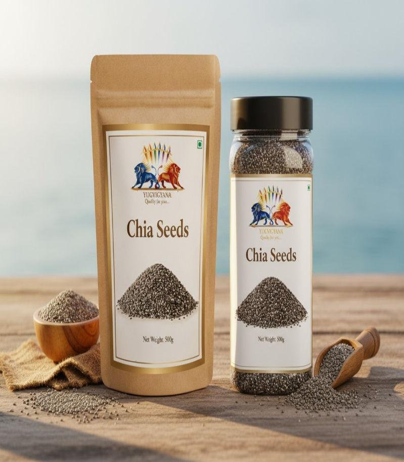 Item Name: Premium Chia Seeds - Omega-3 Rich Superfood Brand: YUGVIGYANA Form: Whole Seeds Grade: Premium Quality - A Grade Diet Type: Vegetarian, Gluten-Free, Vegan Packaging: Food-grade resealable pouch with moisture barrier Net Weight: 250g / 500g / 1000g (Multiple variants) Bulk Pack: 5 Kg & 10 Kg available Storage: Store in cool, dry place away from direct sunlight Certification