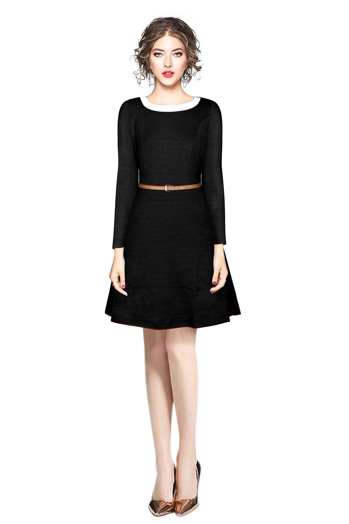 Embrace timeless style with this elegant black A-line dress designed for a refined and polished look. Featuring a subtle contrast neckline, this dress adds a modern touch to a classic silhouette. The long sleeves provide a sleek appearance while offering comfortable coverage, making it perfect for cooler days or professional settings.