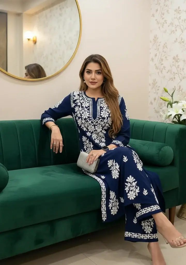 Step into sophistication with this classy navy blue Chikan embroidered kurti set. The rich color beautifully enhances the detailed white floral embroidery, giving it a royal and graceful look. Designed with a flattering straight-cut silhouette and matching embroidered pants, this outfit is ideal for office wear, small functions, and evening gatherings.