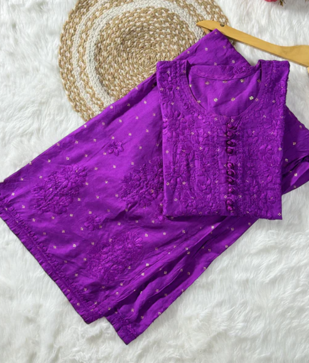 DISHI Purple Pure Chanderi Silk Chikankari Kurta Palazzo Set
