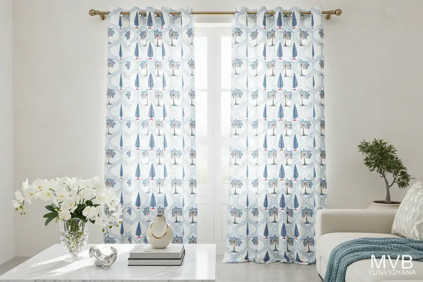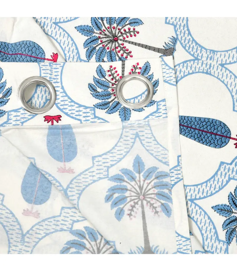 Bring home the eternal beauty of Jaipur with our Hand Block Printed Blue Trees and Flowers Cotton Curtains. Made by accomplished artisans employing traditional Rajasthani hand block print techniques, these curtains include a peaceful blue botanical pattern of trees and flowers in bloom that brings a soothing, earthy sophistication to any room.