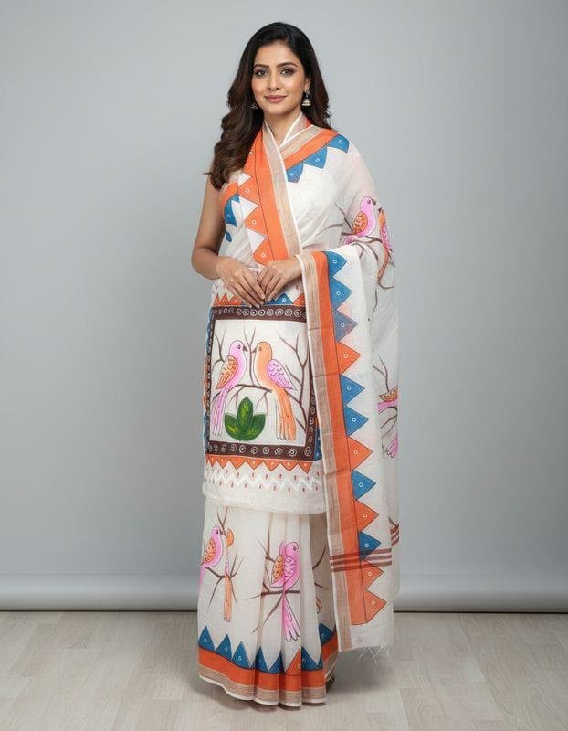 The elegant off-white or natural cotton base beautifully highlights the vibrant hand-painted art. Some sarees also come with subtle golden, silver, or coloured borders that enhance the overall aesthetic and bring out a rich, traditional look.