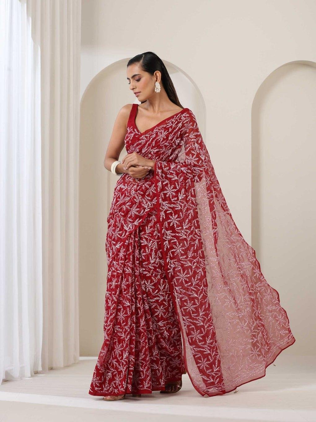 Elegant chiffon tapchi saree which always remains a favorite of people in demand due to its high workmanship Lucknowi’s famous chikankari work and tapchi thread which gives a different, lovely feeling after wearing. Since the fabric is chiffon, it will be more comfortable in summer season.