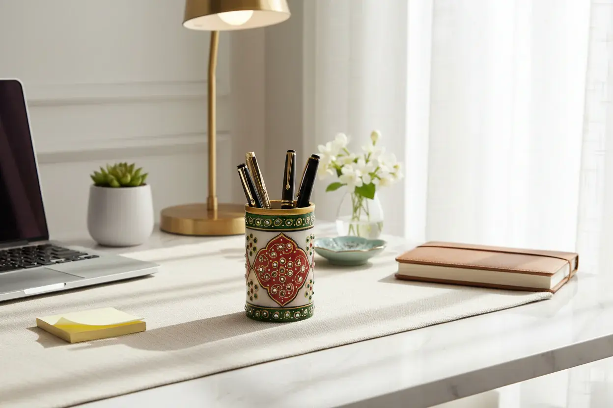 Meenakari is a rare traditional enamel painting artistry characterized by its beautiful floral and geometric motifs. Every pen holder is intricately painted by a master artist, and hence, it is an individual work of art that can add beauty to any interior—you office, study room, or living room.