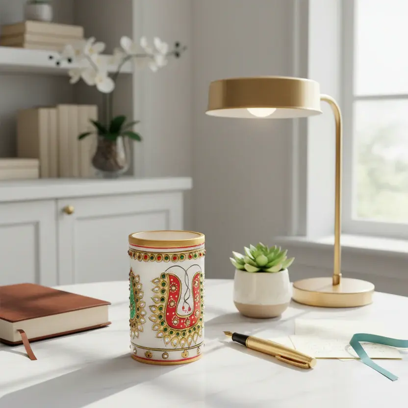 Dress up your office space with this stunning Marble Meenakari Work Pen Holder, a perfect fusion of royalty and artistry. Handmade by expert craftsmen, this pen holder is more than a desk decor but a decor that oozes sophistication and heritage.