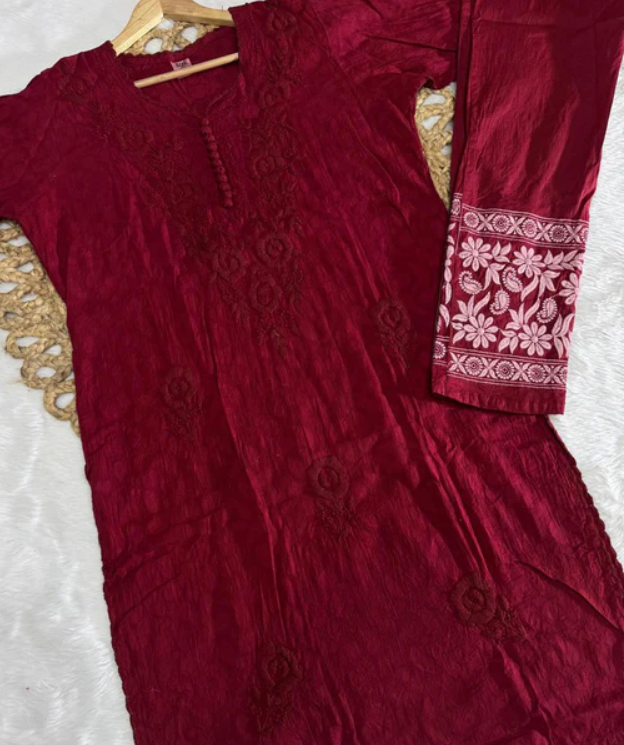 NANDINI Pure Brasso Chikan Kurti Pant Set Maroon