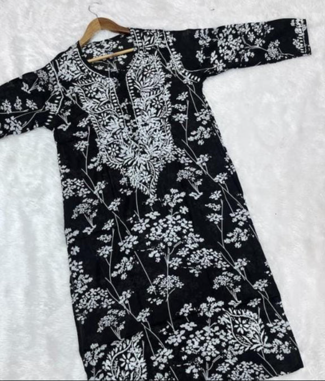 - ✨ Handcrafted Chikankari Work: Delicate white thread embroidery enhances the printed black fabric with timeless charm.