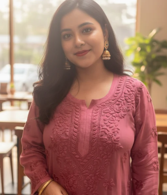 Experience timeless elegance with the NITYA Mauve Pure Viscose Chikankari Omray Kurti, a beautifully handcrafted piece that celebrates the rich artistry of handmade Lucknowi Chikankari from Lucknow . Intricately designed with fine 3D emboss hand embroidery across the front, this kurti reflects exceptional craftsmanship and refined ethnic luxury.