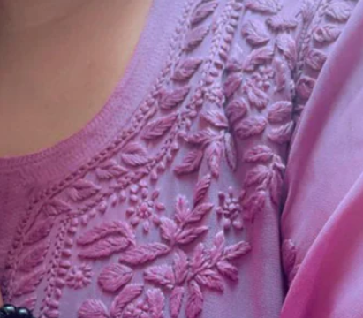 - Work: Full-front jaal design with fine handcrafted 3D emboss Chikankari