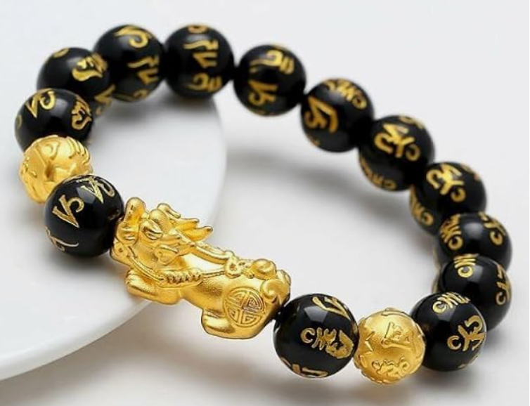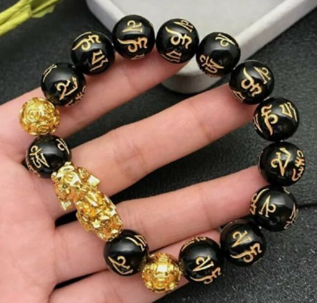 - AUTHENTIC DESIGN: Black obsidian beads with golden Om Mani inscriptions and traditional Pixiu charm create an elegant feng shui bracelet