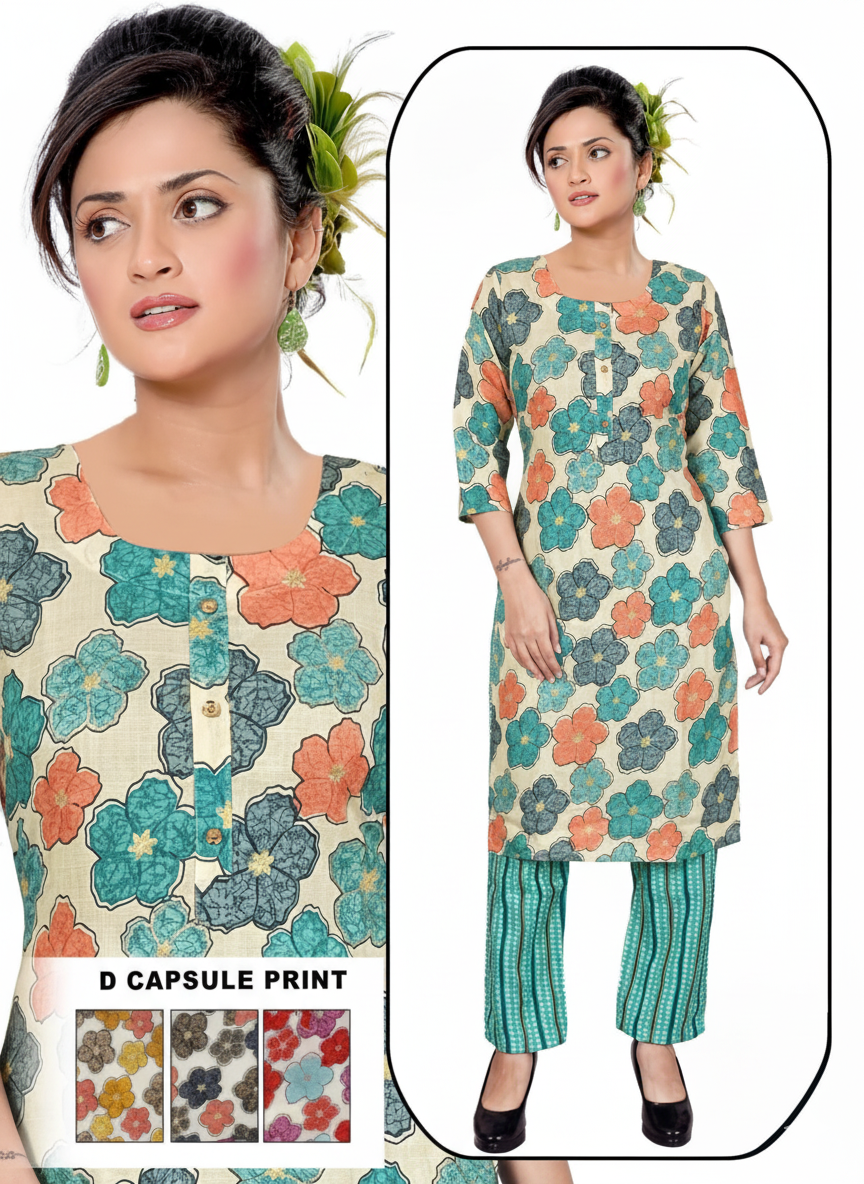 Paired with a matching bottom, this ready-to-wear set offers a coordinated look with all-day comfort and easy movement. Lightweight and skin-friendly, it drapes beautifully and enhances your silhouette while keeping you comfortable throughout the day.