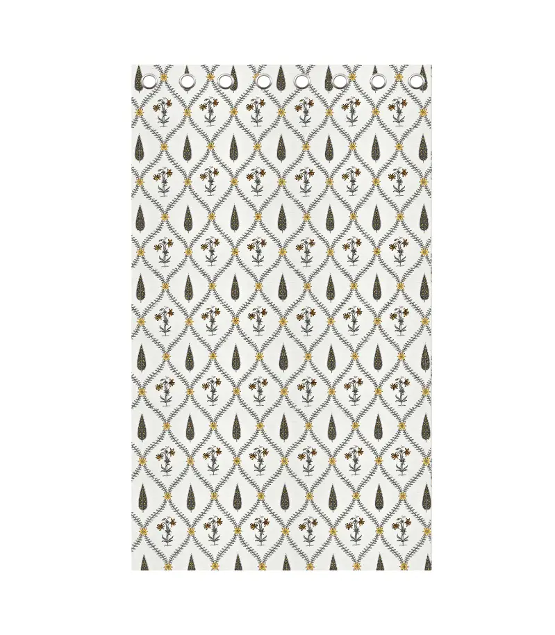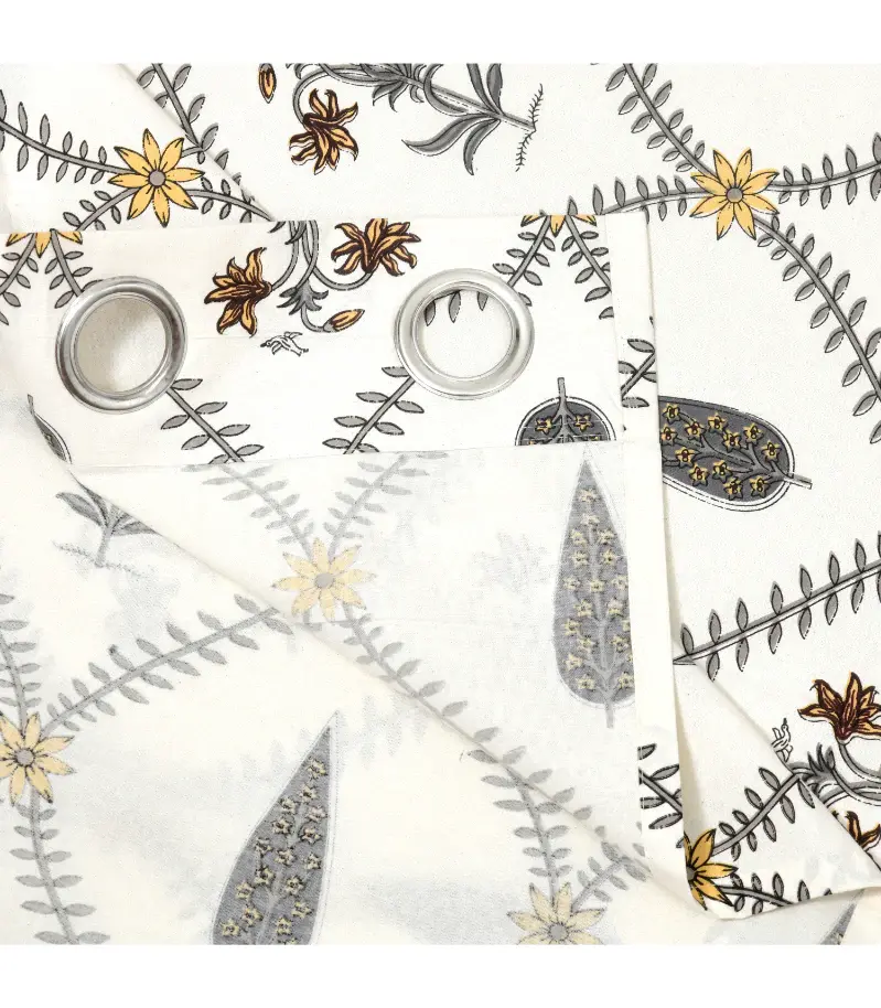 Bring the joy and artistry of tradition into your home with our Pookalam Bloom Curtains. These curtains draw inspiration from the timeless floral rangolis of South India. Their soft yellow and grey color palette radiates warmth, reminiscent of a sunny morning filled with blooming petals. Each curtain is hand-block printed in the Rihaa style. Every flower and leaf is carefully stamped by hand, transforming fabric into art. Made from 100% pure cotton, these curtains are light, breathable, and ideal for spaces that need freshness and light. These curtains are perfect for your bedroom, living room, or a cozy corner for tea and relaxation.