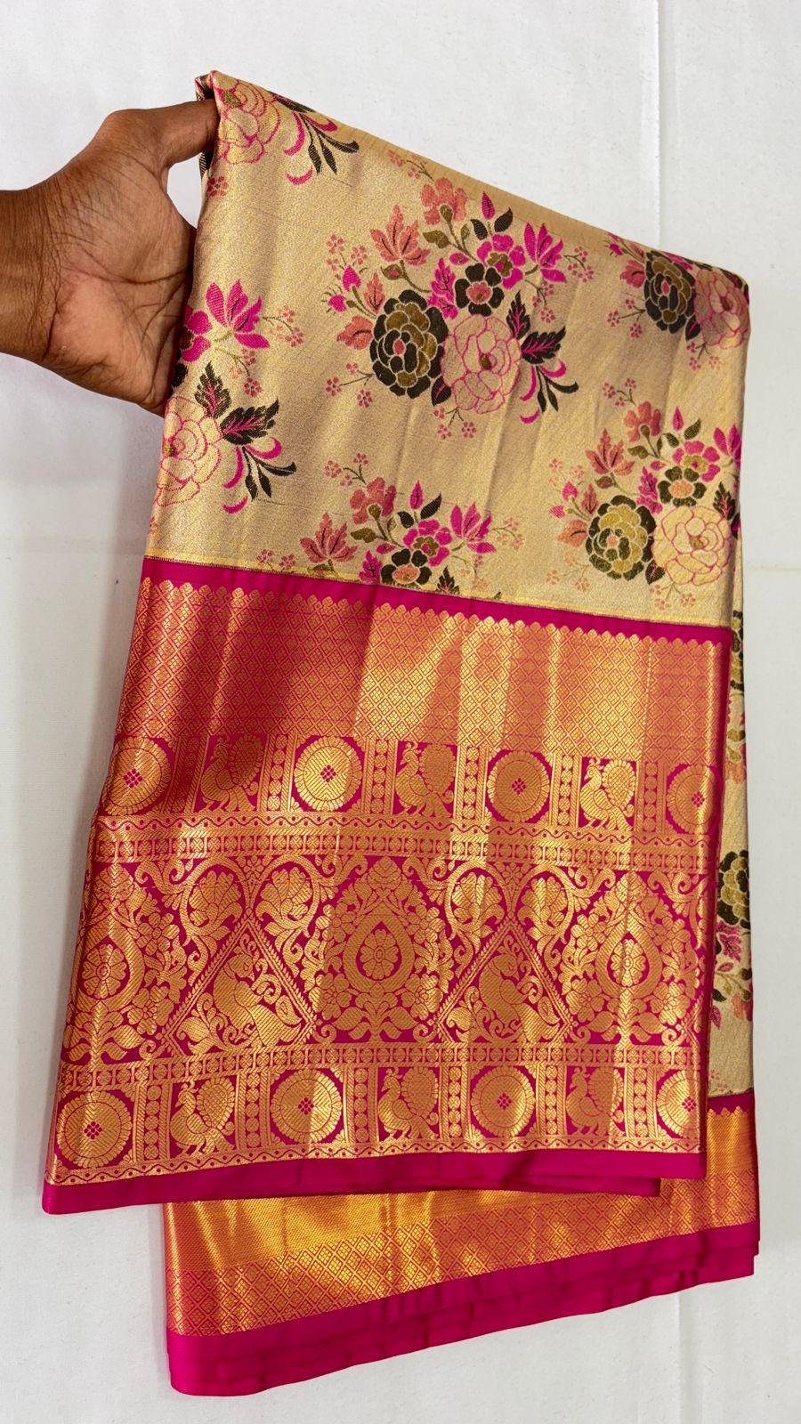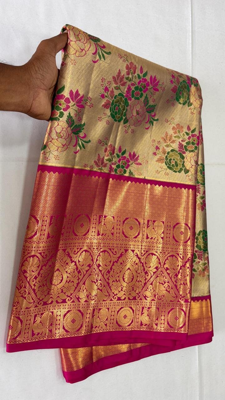 Crafted from high-quality tissue silk, this saree features a soft, lightweight texture with a luminous sheen that enhances the bridal glow while ensuring comfort throughout long celebrations.