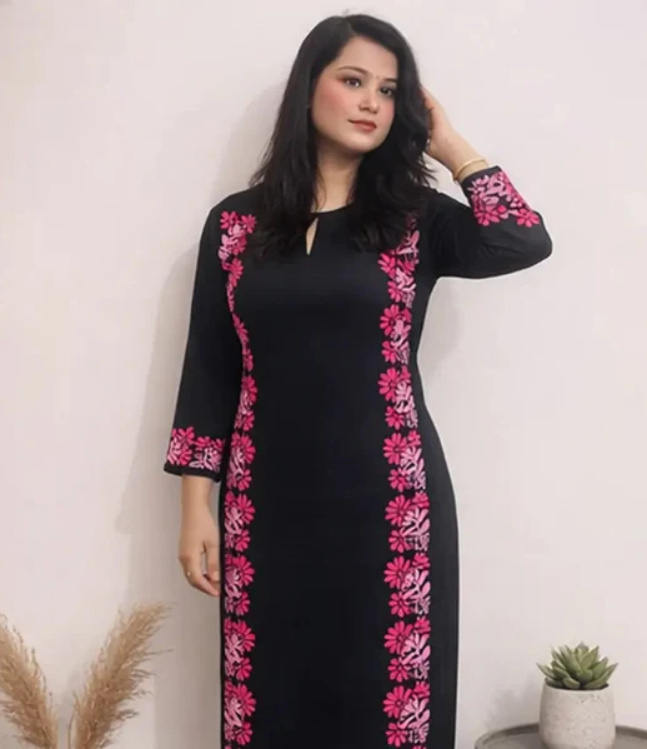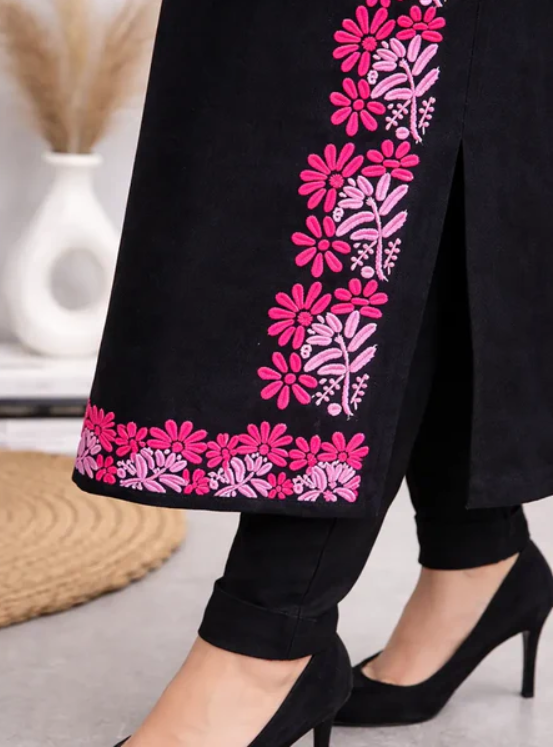 Make a bold yet elegant statement with this Black Chikankari Modal Kurti, beautifully handcrafted with vibrant pink floral embroidery by skilled artisans of Lucknow . The rich black base creates a striking contrast with the delicate pink Chikankari work, giving this kurti a graceful blend of modern style and traditional charm.