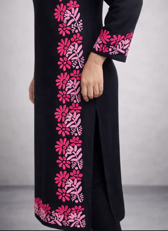 ✔ Elegant black base with pink floral work