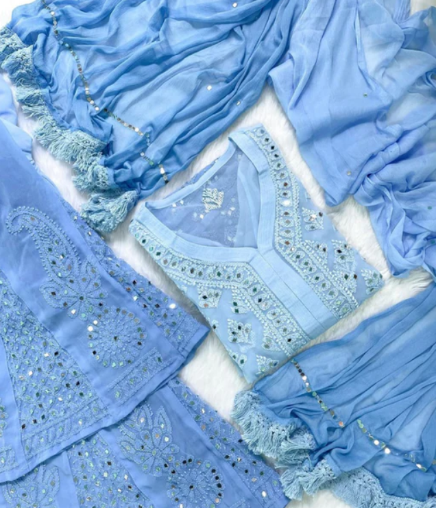 SAPNA Blue Mirror Work Chikankari Kurta Palazzo Dupatta Set
