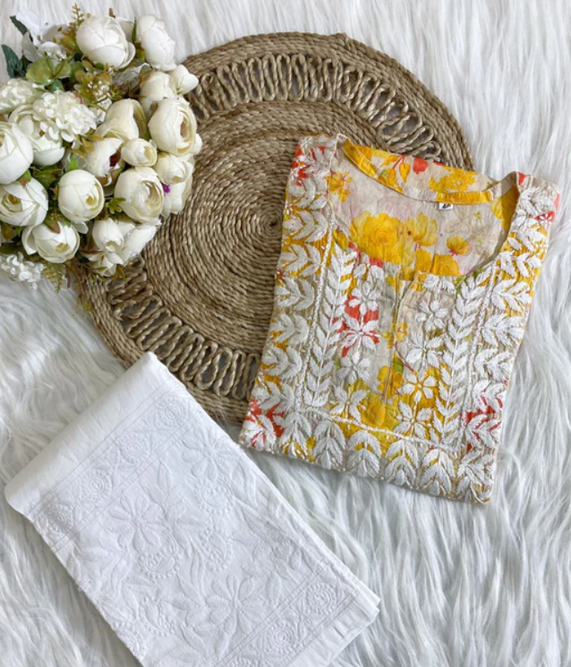 - ✨ Handcrafted Chikankari Work: Elegant white thread embroidery adds timeless sophistication to the printed yellow fabric.