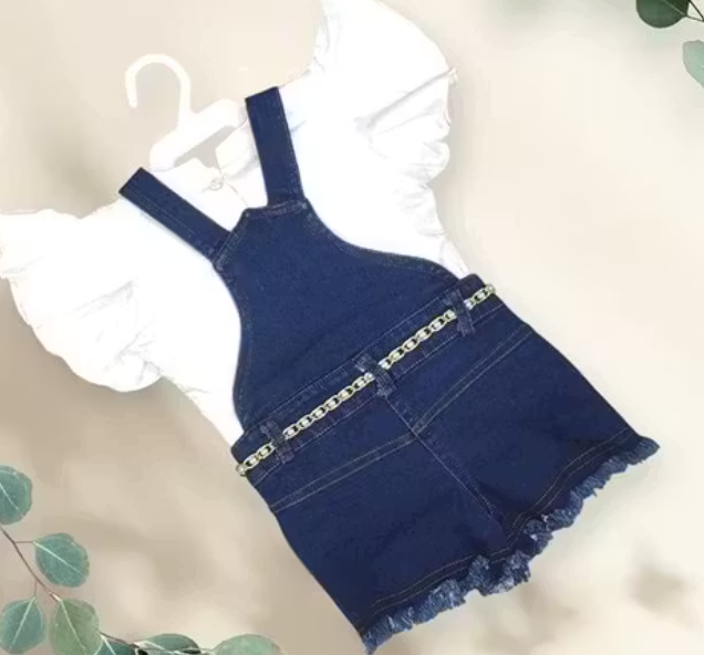 Stylish Baby Girls Denim Dungaree Set with White Puff Sleeve Top