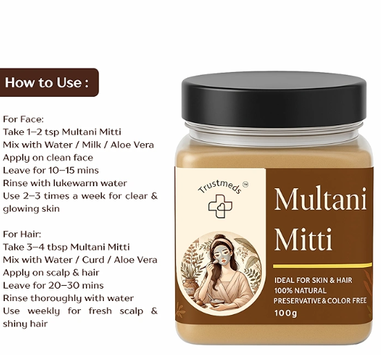 Trustmeds Multani Mitti(Fullers earth), 100% Natural, Ideal for Skin & Hair, Preservative & Color Free, 100g
