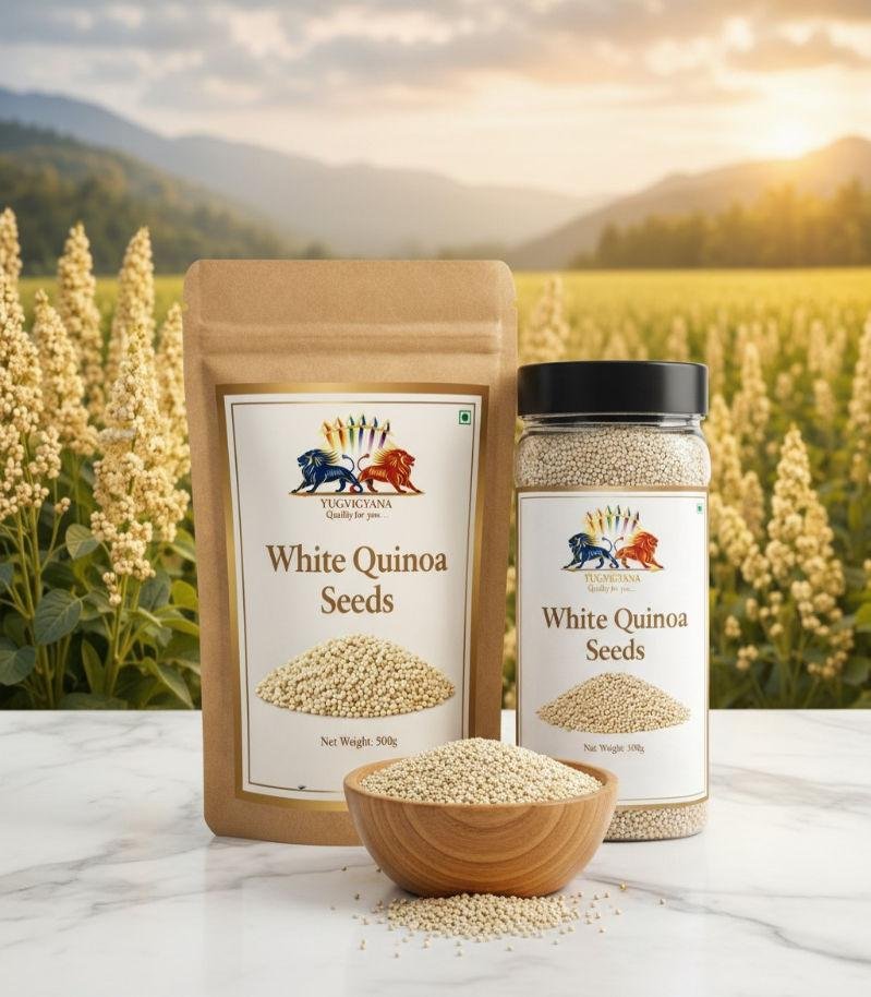 Item Name: White Quinoa Seeds - Premium Superfood Brand: YUGVIGYANA Form: Whole Seeds Grade: Premium Quality - A Grade Diet Type: Vegetarian, Gluten-Free Packaging: Food-grade resealable pouch with moisture barrier Net Weight: 250g / 500g / 1000g (Multiple variants) Bulk Pack: 5 Kg & 10 Kg available Storage: Store in cool, dry place away from direct sunlight Certification: FSSAI Approved