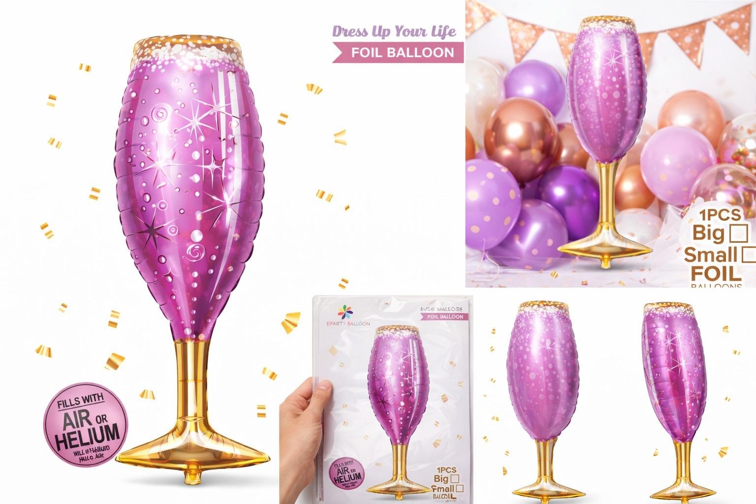 - HK Balloons 36″ Wine Glass & Champagne Foil Balloon – Larger set that includes a wine glass and champagne shape — great as a statement piece for birthday, wedding, or celebration décor.