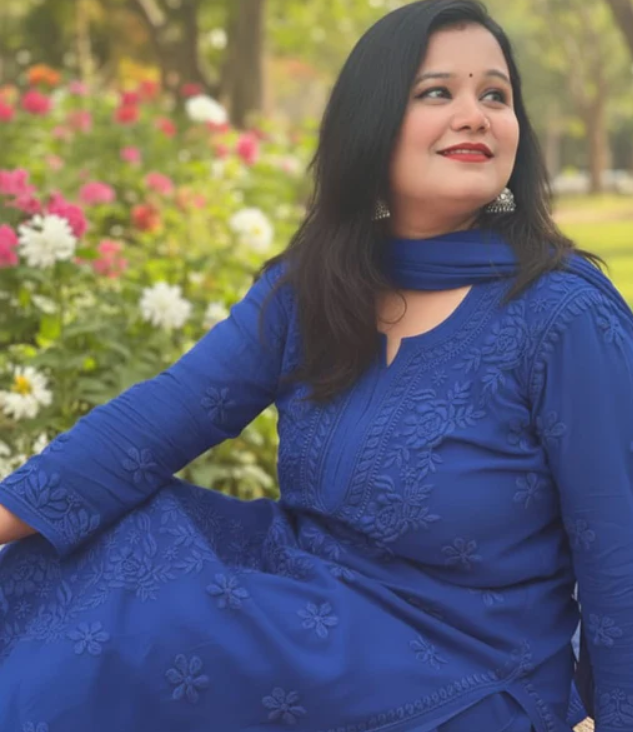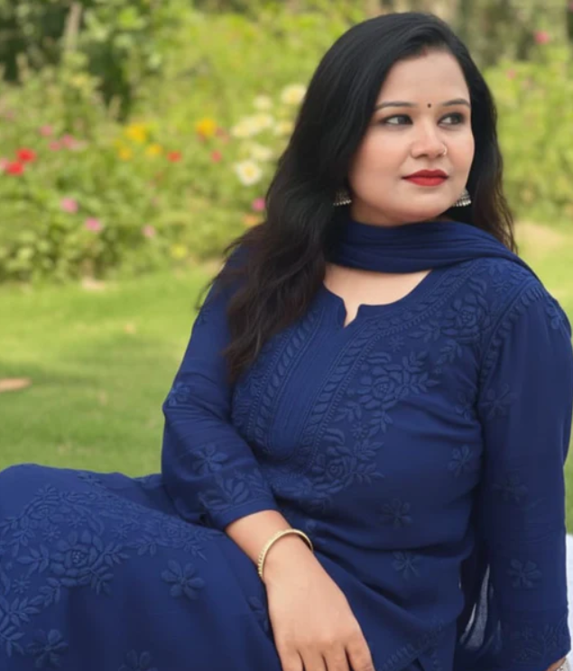 - Work: Full-front jaal design with fine handcrafted 3D emboss Chikankari