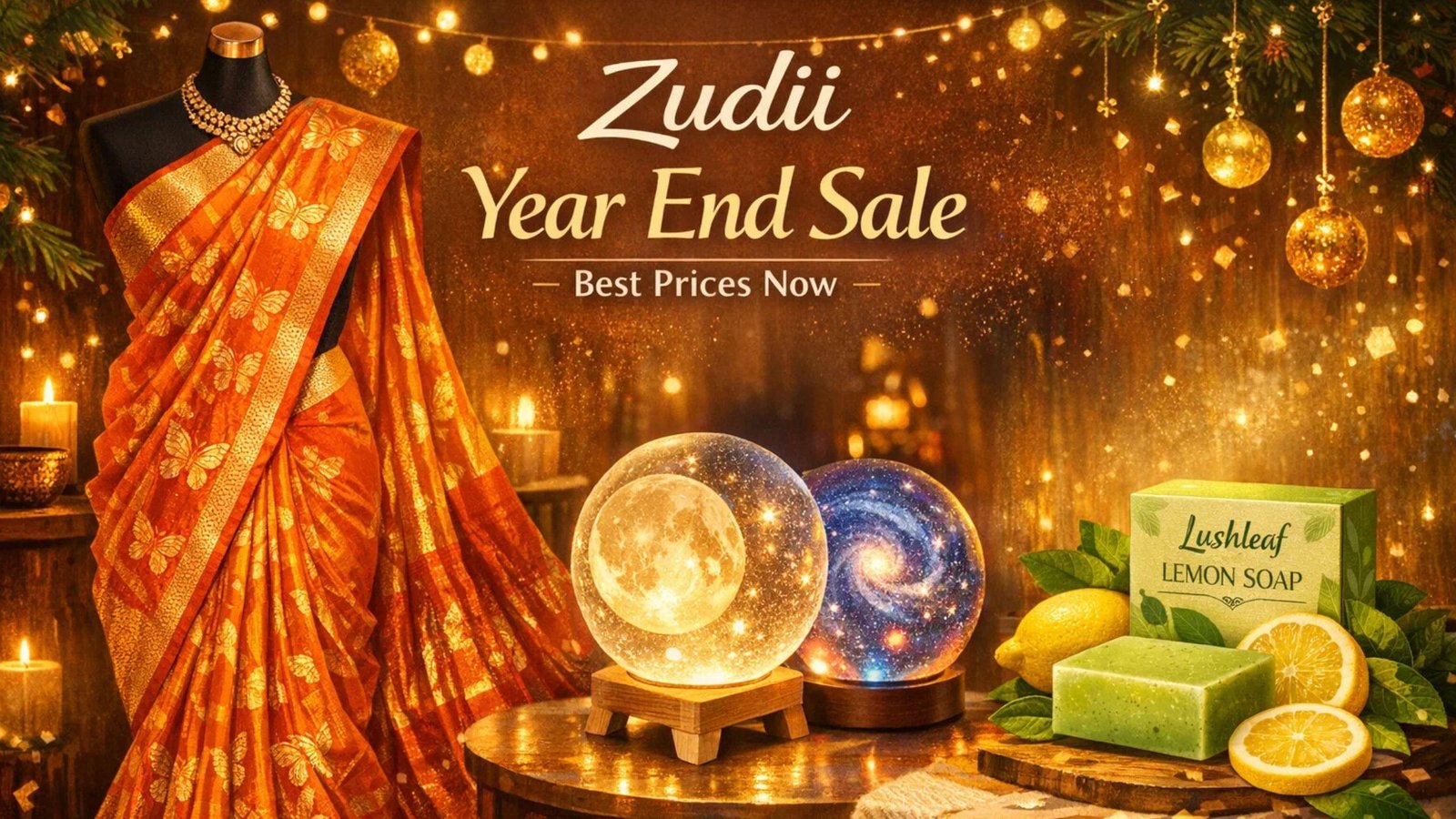Discover the Year End Sale on Zudii! Shop the vibrant Orange Dharmavaram Butterfly Silk Saree, magical 3D Crystal Ball N...