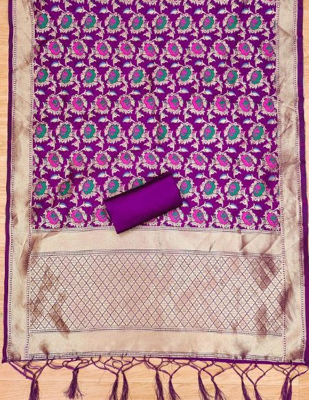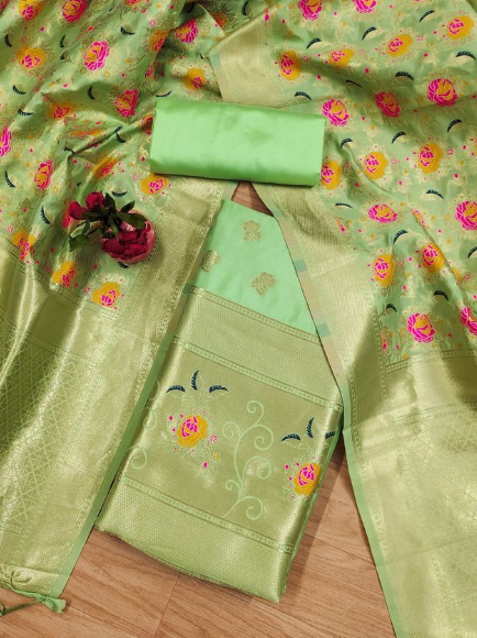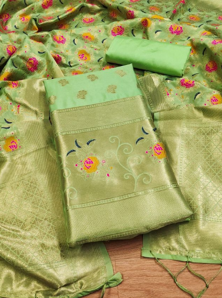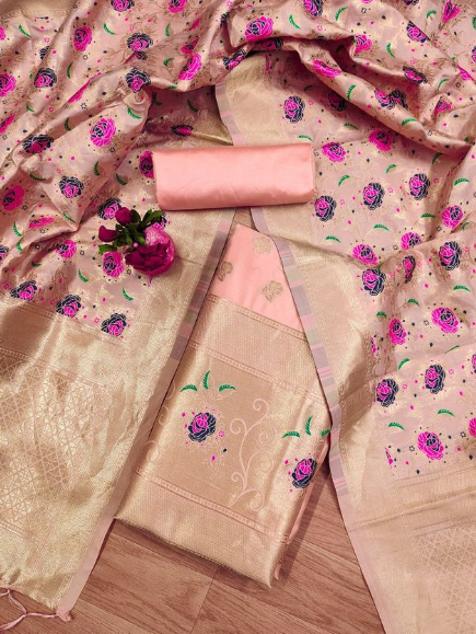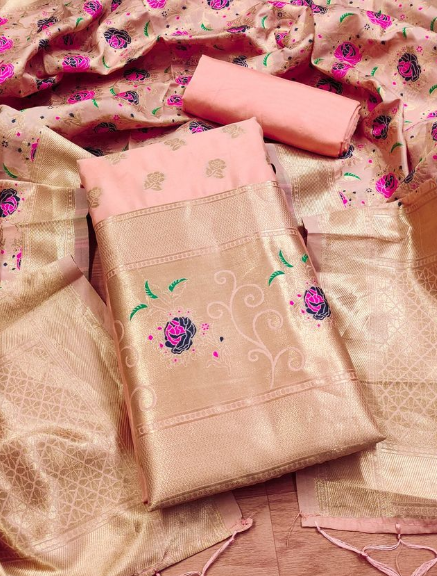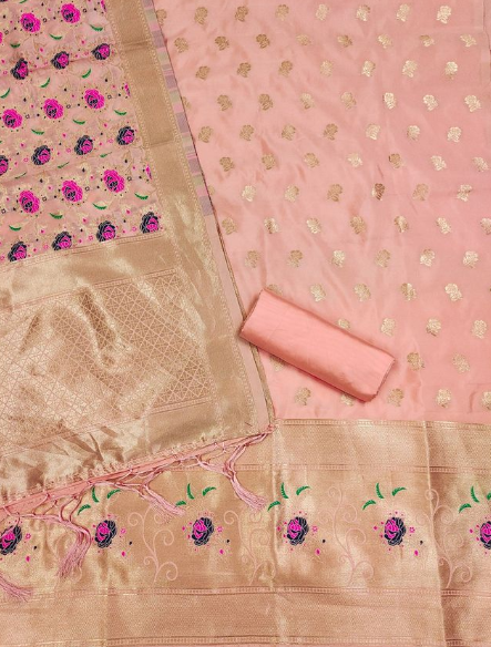 Navy Blue Floral Designer Silk Suit Set with Zari Border
