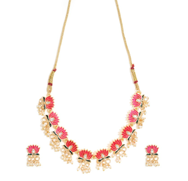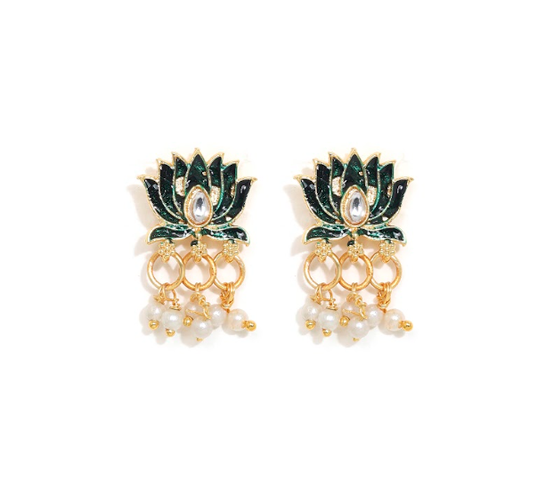 Celebrate timeless elegance with this Gold-Plated Green Enamel Lotus-Motif Necklace and Earring Set, beautifully finished with delicate pearl drops. Inspired by the graceful lotus design, the rich green enamel work paired with a gold-plated finish creates a striking traditional look. Perfect for weddings, festive occasions, temple visits, and cultural events, this set adds sophistication and charm to sarees, lehengas, and ethnic outfits. Lightweight and comfortable, it’s ideal for all-day wear.