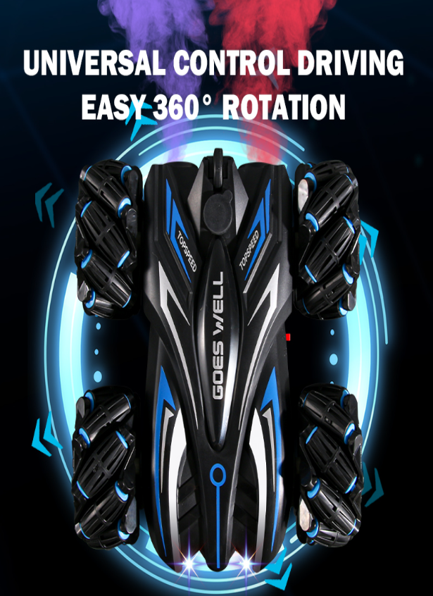Control the car using hand gestures or the included remote for an interactive and immersive driving experience. - 🔄 360° Rotation & Stunt Action