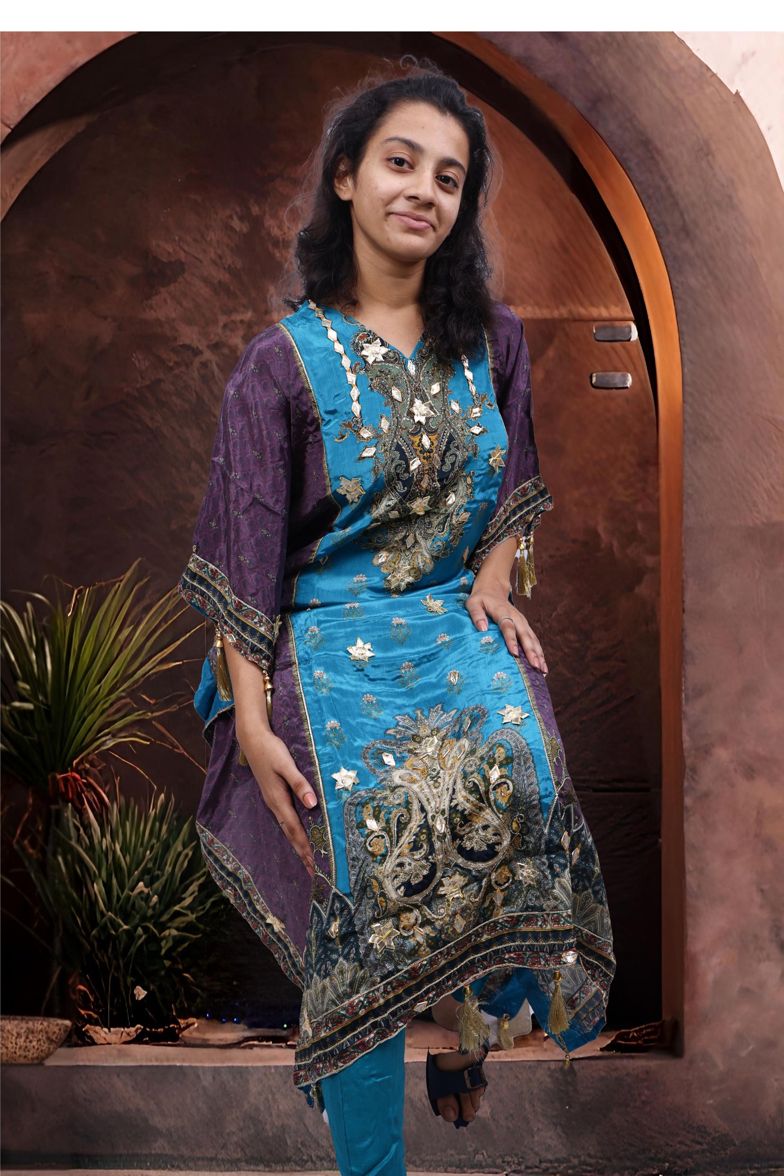 - Kaptan Top: Stylish, long-line design with elegant gota work embroidery — a classic Rajasthani metallic ribbon decorative technique that adds richness and shimmer to the fabric.