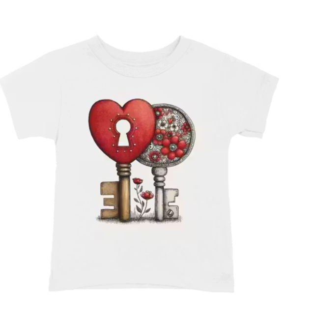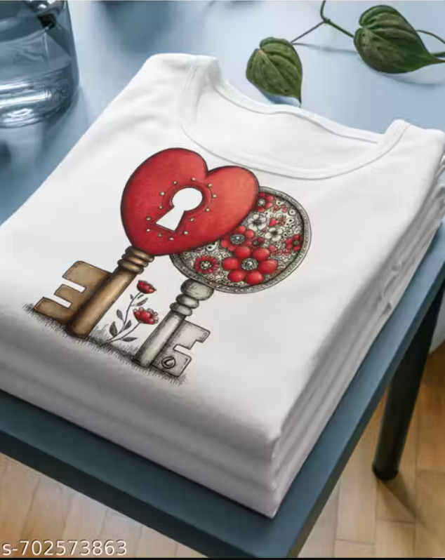 Women White Cotton Printed T-Shirt Heart Key Floral Design Casual Wear Stylish Girls Top