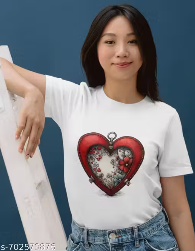 Women White Cotton Printed T-Shirt Heart Lock Floral Design Casual Wear Stylish Girls Top