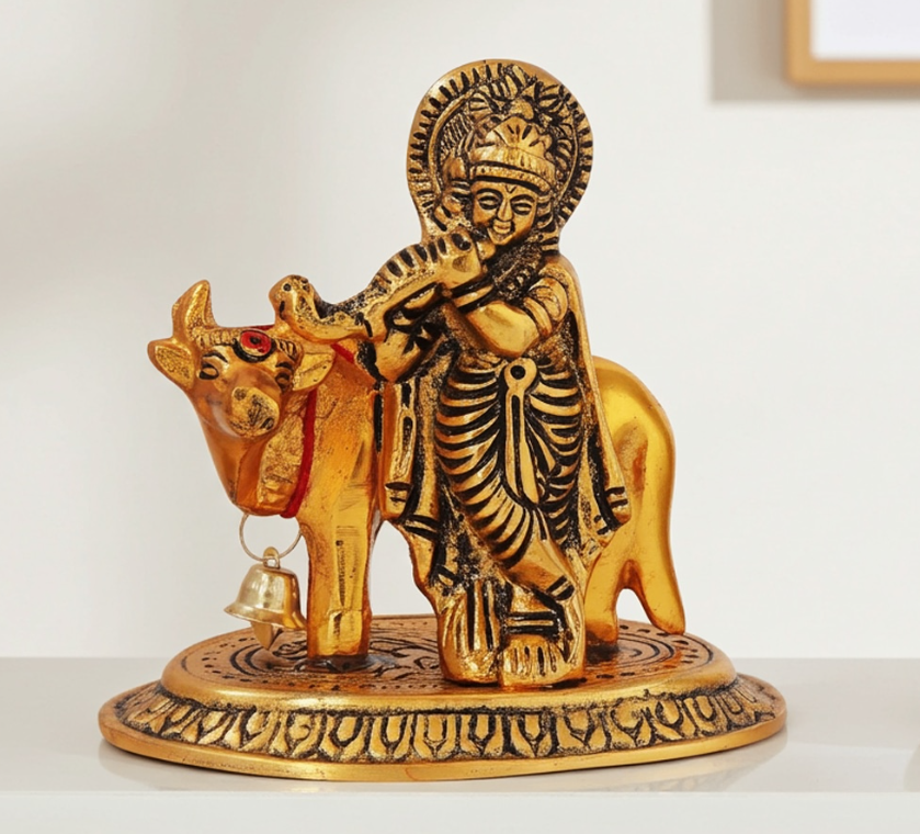 Celebrate divine love and pastoral beauty with this exquisite Aluminium Showpiece Krishna With Cow Statue. Crafted from high-quality aluminium, this detailed statue beautifully captures Lord Krishna in a serene pose alongside a cow, symbolizing compassion, devotion, and harmony with nature.
