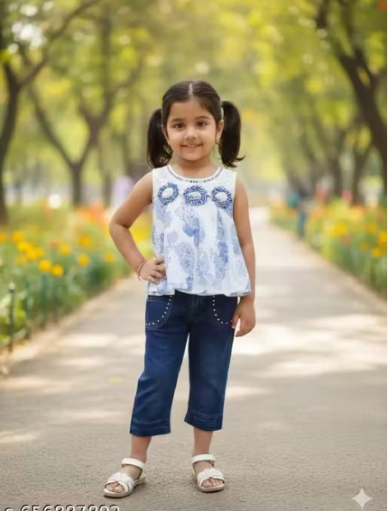 ๐ Product: Bublee Dublee Girls Denim Capri Pant with Printed Chiffon Top