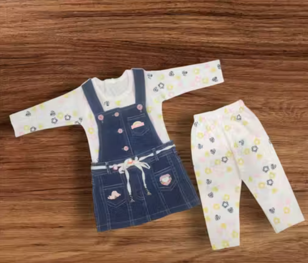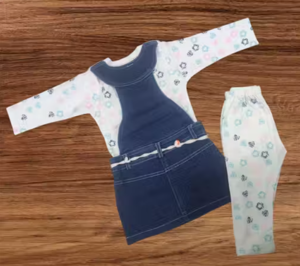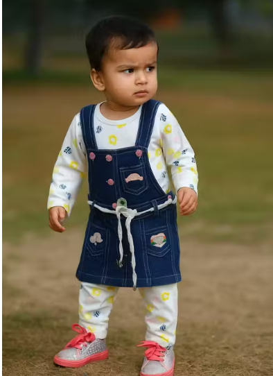 Bublee Dublee Girls Stylish Printed Top & Pant With Denim Dungaree Set