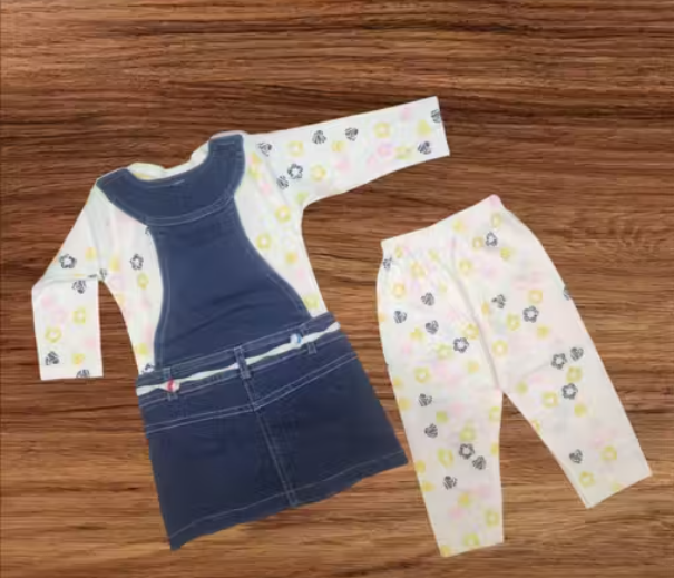 - Top: Crafted from soft denim, featuring a vibrant printed design with long sleeves and a round neck for a classic look.