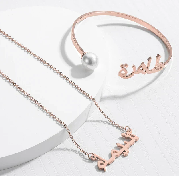 Elevate your jewelry collection with this sophisticated combo featuring a personalized Arabic name necklace paired with an elegant pearl bangle. The necklace showcases your name rendered in graceful Arabic script, creating a meaningful piece that celebrates cultural heritage and personal identity. The accompanying pearl bangle adds timeless refinement with its lustrous finish and classic appeal. Together, these pieces offer versatile styling options—wear them individually for understated elegance or layer them for a coordinated, polished look. Perfect for daily wear or special occasions, this combination makes an exceptional gift for someone who values personalized, culturally significant jewelry.