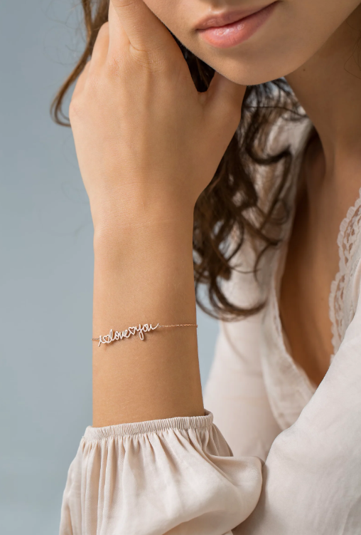 This personalized gold bracelet features a dainty name charm with custom handwriting, making it the perfect gift for any mom. Handmade with care, this unique piece of jewelry is a beautiful way to keep loved ones close. A thoughtful and sentimental gift that will be treasured always.