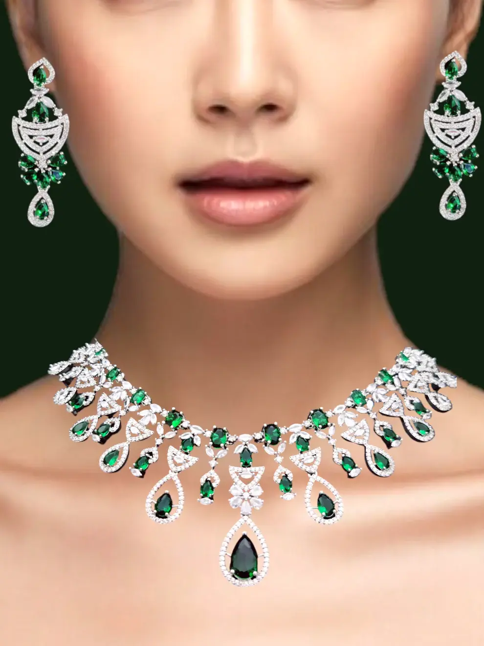 Elevate your look with this stunning necklace and earrings set, adorned with dazzling green stones and intricate diamond-like detailing. This piece features teardrop-shaped emerald-green stones, set in a shimmering silver-tone base, exuding timeless elegance and sophistication. Perfect for weddings, special occasions, or festive celebrations, this set offers a regal touch to any outfit, blending traditional charm with modern allure.