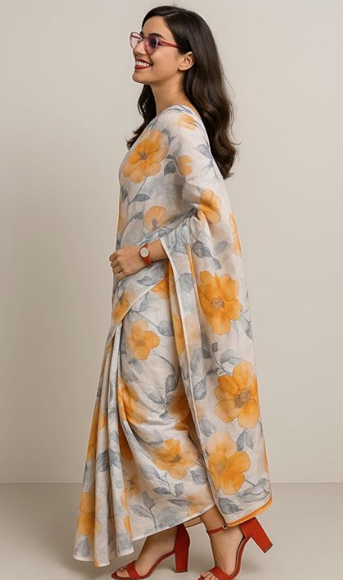 Floral Print silk Saree with Yellow Flowers, White Base, Grey Leaves Pattern, Traditional Indian Wear