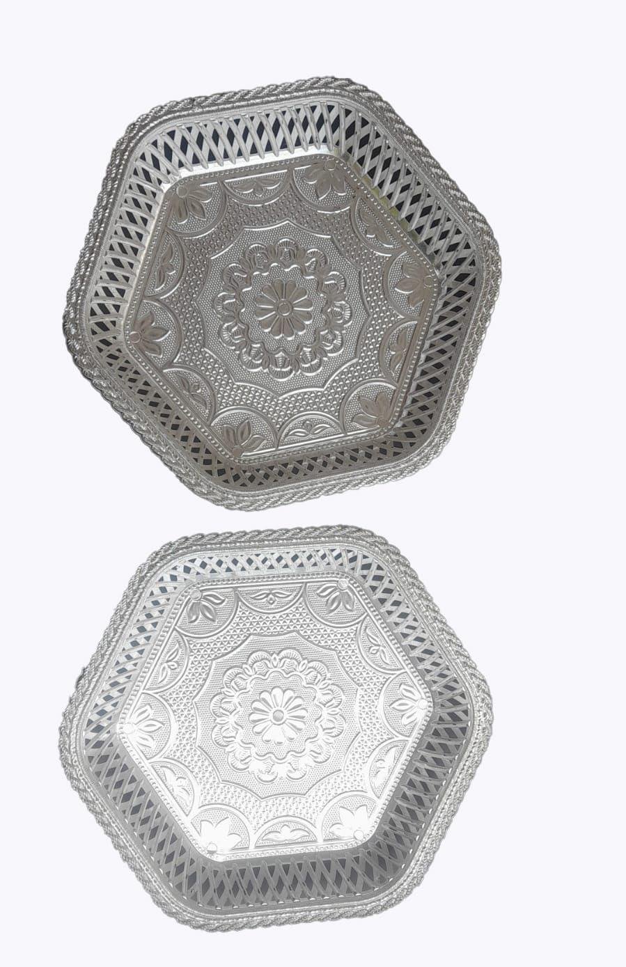 German Silver Coated Hexagon Shape Decorative Tray with Floral Pattern