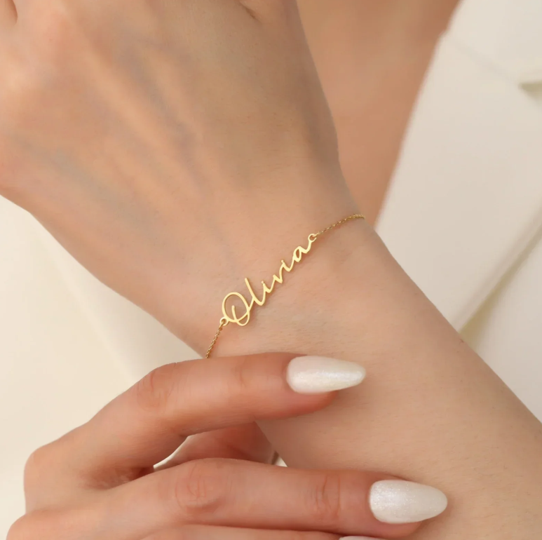 Elevate your gifting game with our Gold Plated Custom Name Bracelet. Perfect for birthdays, Valentines Day or as a thoughtful friendship or Mother's Day gift. Personalize with a name for a one-of-a-kind piece. Made with quality materials and expert craftsmanship. Show your love with this elegant and unique bracelet.